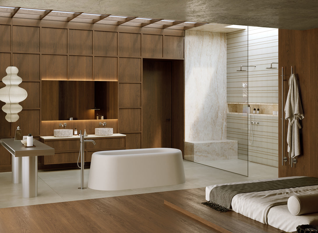 Een zwevend badmeubel dat de essentie van Neo Japandi belichaamt: rust met karakter, eenvoud met impact.
