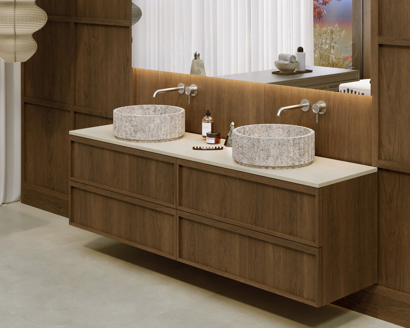 Vier modellen handgemaakte natuursteen waskom in vijf exclusieve marmersoorten. Van de warme Patara Beige tot de dramatische Emperador Dark, van subtiel Silver Travertin tot het unieke Breccia Blue. Elke marmeren waskom vertelt zijn eigen verhaal, gevormd door de natuur en met de hand afgewerkt door ambachtslieden.